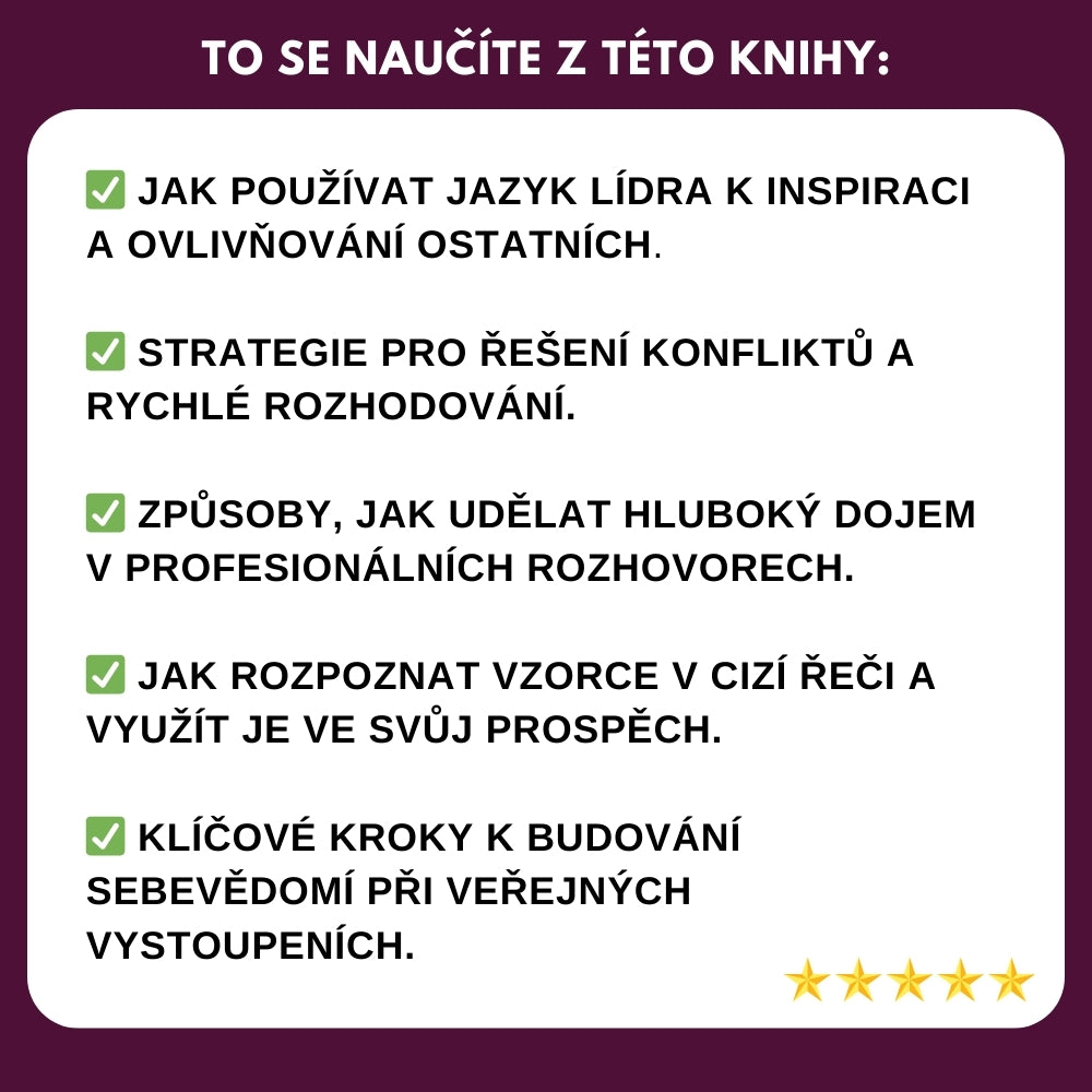Nauč se mluvit s jistotou, jasností a autoritou – přesně jako špičkoví lídři. Tato kniha poskytuje praktické nástroje a dovednosti pro každodenní komunikaci, obchodní jednání a působivé prezentace. Bez ohledu na tvou aktuální úroveň tě tento průvodce posune na vyšší úroveň vyjadřování.